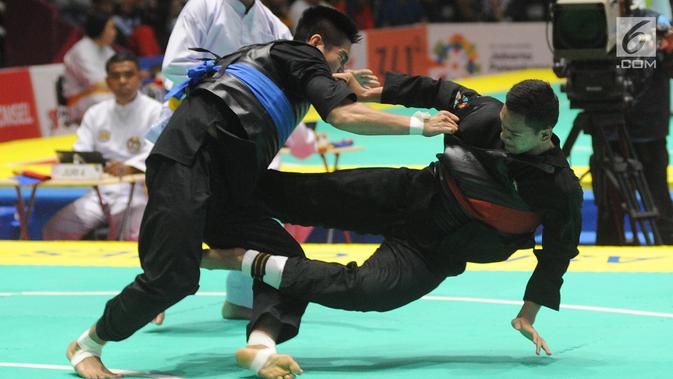 Pesilat Aji Bangkit Pamungkas saat bertarung melawan Duy Tuyen Nguyen dari Vietnam pada semifinal kelas I putra 85kg-90kg Asian Games 2018 di Padepokan Pencak Silat, TMII, Jakarta (26/8). Aji berhasil menang dengan skor 5-0. (Merdeka.com/Arie Basuki)