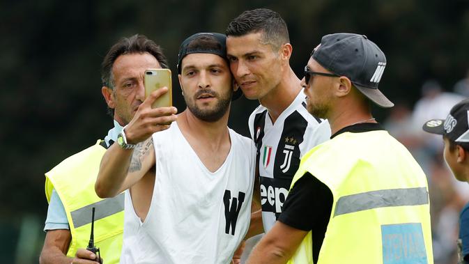 Penyerang Juventus, Cristiano Ronaldo dikejutkan seorang suporter yang ingin mengajaknya berselfie saat pertandingan persahabatan melawan tim B di Villar Perosa, Italia utara from Berita Hari Ini, Kabar Harian Terbaru Terkini Indonesia - Liputan6.com https://ift.tt/2Mhu36F
