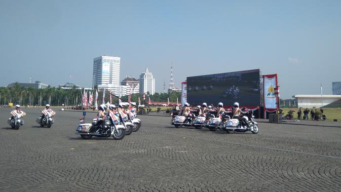 Liputan6.com, Jakarta - Jajaran Polwan Direktorat Lalu Lintas Polda Metro Jaya menampilkan aksi motor gede (moge) dalam upacara Hari Ulang Tahun ke -70 Polisi Wanita (Polwan) Republik Indonesia di Monumen Nasional, Jakarta Pusat, Senin (3/8/2018).
