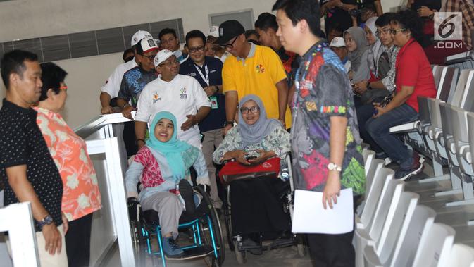 Menteri Sosial, Agus Gumiwang Kartasasmita (kaus kuning) bersama penyandang disabilitas dan Ketua Inapgoc, Raja Sapta Oktohari saat mengecek kesiapan venue Asian Para Games 2018 di Jakarta, Jumat (28/9). (Liputan6.com/Helmi Fithriansyah)