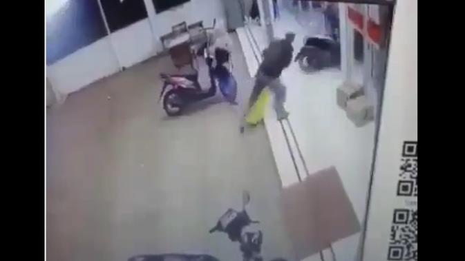 Sebuah kamera CCTV merekam sepasang pria dan wanita pengendara skuter matik merusak kaca jendela mini market. Hanya saja, kejadian ini bukan karena disengaja.