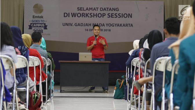 VP of Talent Bukalapak Gema Buana Putra menjadi pembicara dalam Emtek Goes To Campus di UGM, Yogyakarta, Selasa (16/10/2018). EGTC juga menghadirkan kompetisi news presenter, inspiring sharing dan entertainment talk. (Liputan6.com/Herman Zakharia)