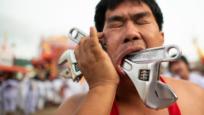 0 Response to "FOTO: Festival Vegetarian Ekstrem, Tusuk Pipi Pakai Pedang hingga Kunci Inggris"