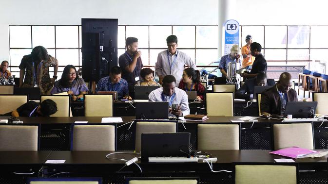 Seorang jurnalis mengetik berita pertemuan tahunan IMF-Bank Dunia di Nusa Dua, Bali, Senin (8/10). Menkominfo Rudiantara memastikan fasilitas internet kencang untuk tamu dan media dalam pertemuan tahunan ini. Liputan6.com/Angga Yuniar)