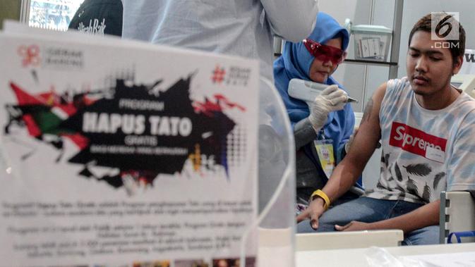 Petugas Komunitas Gerak Bareng menghapus tato dalam Hijrah Fest 2018 di Jakarta, Sabtu (10/11). Selain menyetor hapalan surat Alquran, peserta juga diharuskan menyertakan surat medical check up HIV, diabetes dan hepatitis. (Liputan6.com/Faizal Fanani)