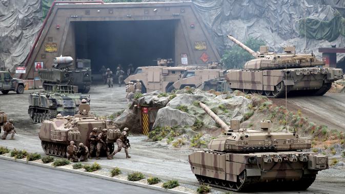 Tentara Uni Emirat Arab (UEA) menggelar latihan militer saat pembukaan Pameran dan Konferensi Pertahanan Internasional (IDEX) di Abu Dhabi, UEA, Minggu (17/2). IDEX menghadirkan teknologi terbaru di sektor pertahanan darat, laut, dan udara. (AFP)