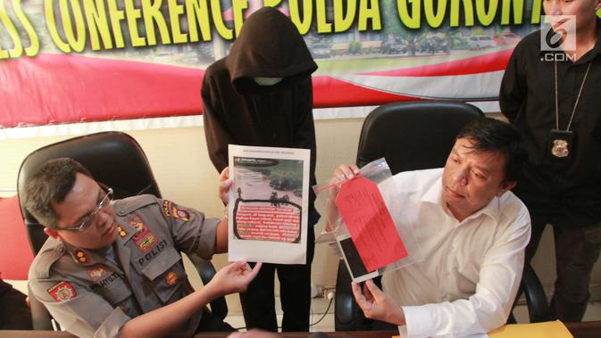 Petugas menunjukkan barang bukti beserta pria IB alias Ismail di Polda Gorontalo, Selasa (28/5/2019). IB harus berurusan dengan pihak kepolisian setelah ia memposting salah satu video kekerasan yang sudah ditambah bahwa itu merupakan kekerasan yang dilakukan Kepolisian.(Liputan6.com/Arfandi Ibrahim)