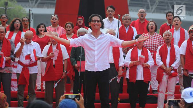 Komposer musik Addie MS bersama sejumlah tokoh, seniman dan artis melakukan deklarasi Indonesia Bangkit saat hari kebangktian nasional ke 111 tahun di GBK, Jakarta, Senin (20/5). Tujuan deklarasi ini untuk menyegarkan kembali ingatan dan tekad merawat persatuan Indonesia. (Liputan6.com/Angga Yuniar)