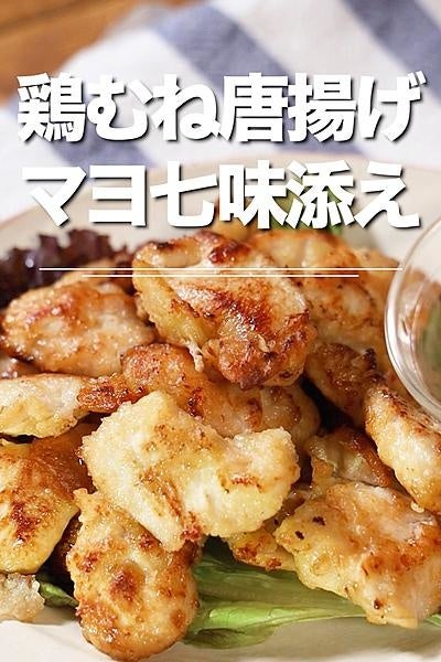 価格が安定している鶏むね肉をメインで使用した唐揚げレシピです。鶏むね肉に下味をつける際、マヨネーズを一緒に加えることで衣がサックリと仕上がります。ソースにかけた七味が唐揚げとよく合い、おかずにもおつまみにもオススメのレシピです。
